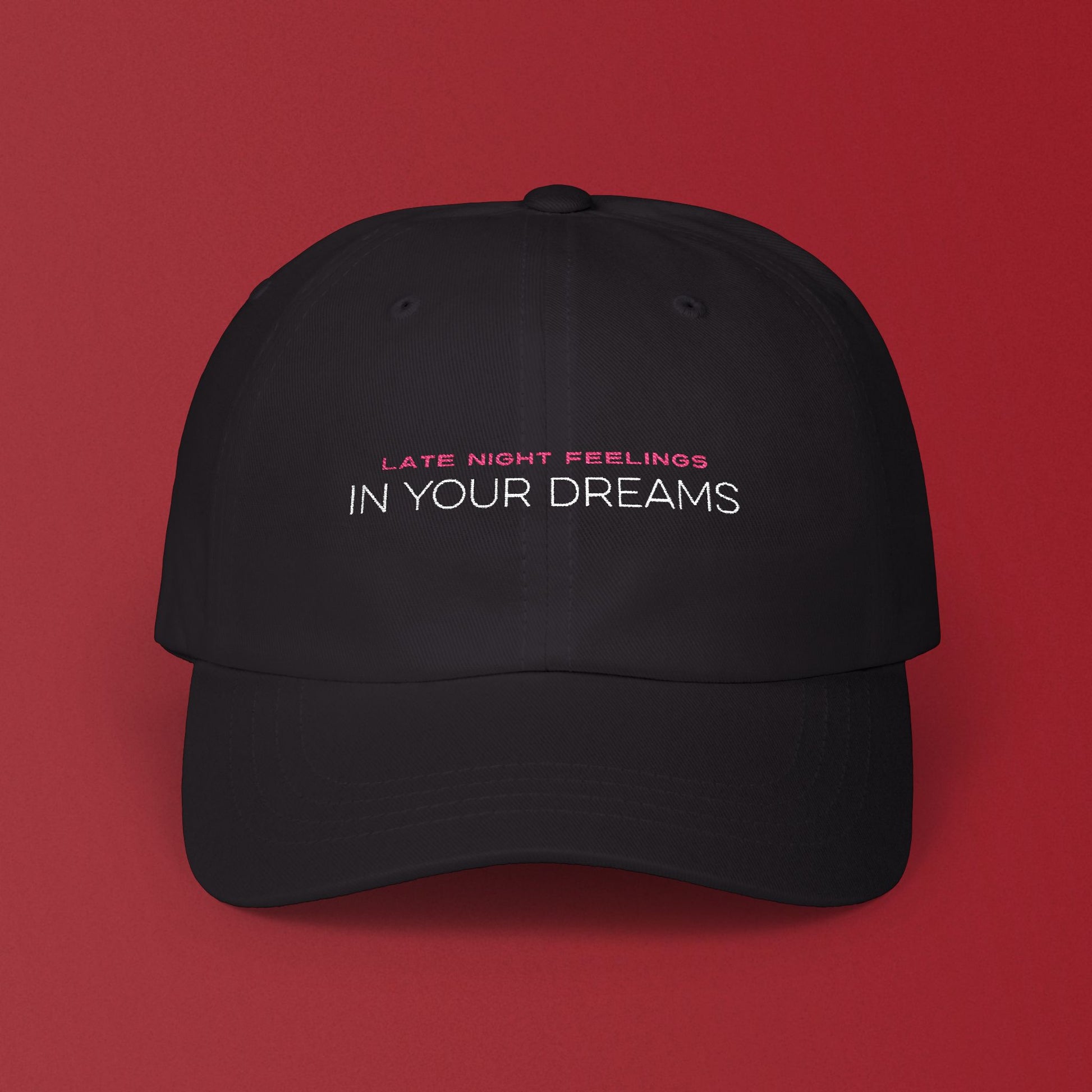 A classic look with a dreamy twist. This black cap features the In Your Dreams logo by Late Night Feelings, embroidered in crisp white and pink for a sleek, versatile finish. Perfect for late-night fits, casual days, or just repping the album wherever you go.