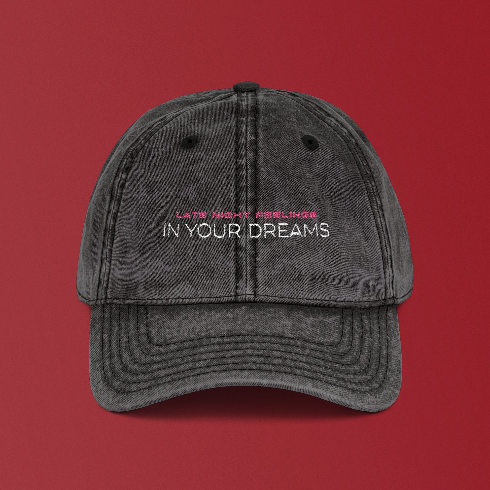 Laid-back and lived-in, this washed black dad hat gives effortless cool to the In Your Dreams logo by Late Night Feelings. With its distressed finish and embroidered detail, it’s the perfect accessory for casual fits and late-night wanderings.