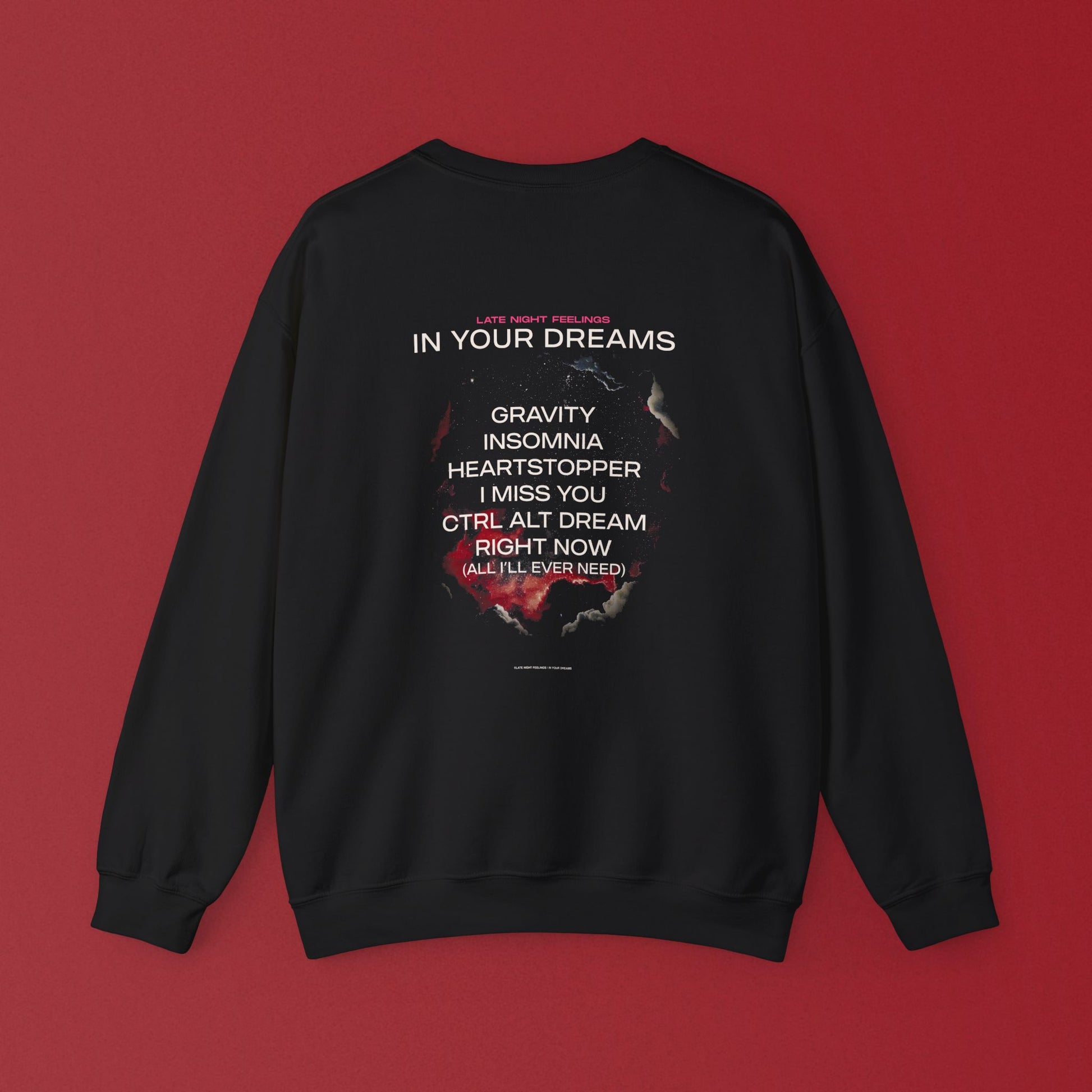 Step through the window into dreamspace. This In Your Dreams crewneck from Late Night Feelings features the official album artwork on the front — an open window into the cosmos and the complete tracklist printed on the back.