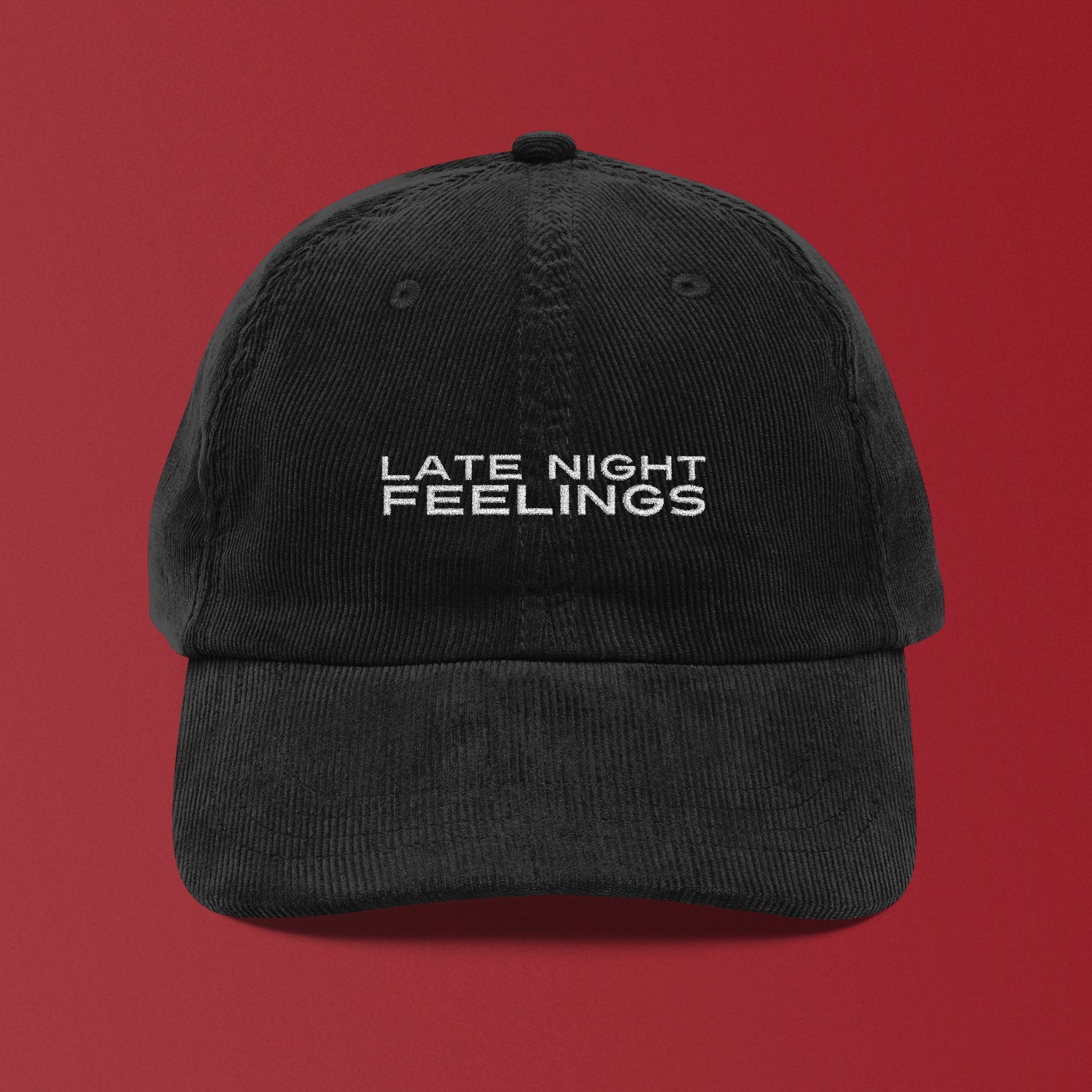 A classic silhouette with a luxe twist. This corduroy cap features the Late Night Feelings logo embroidered on the front, bringing cozy texture and timeless style together in one sleek piece.
